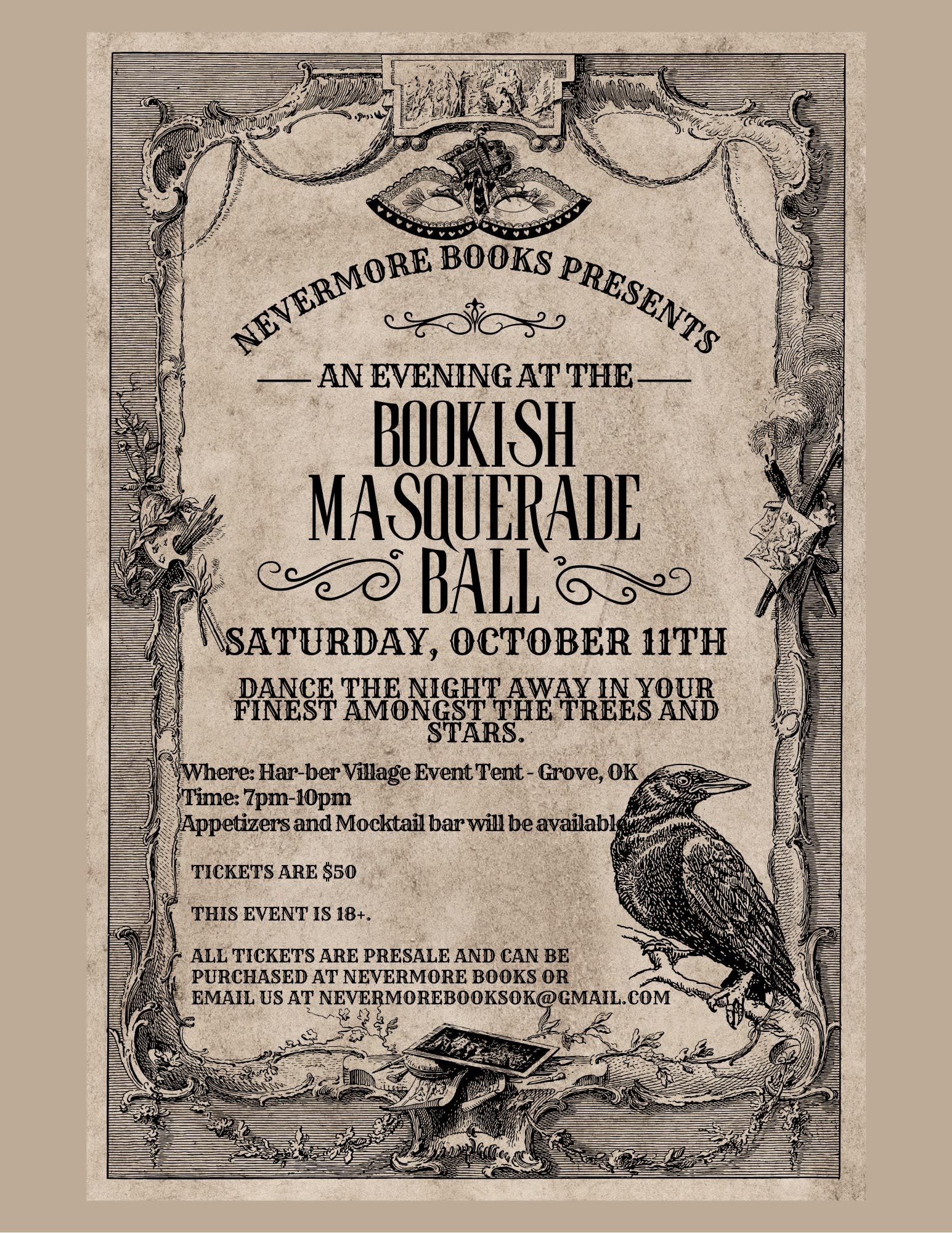 Dance the night away at this Costume Bookish Event presented by Nevermore Books. All tickets are presale and purchased at Nevermore Books, 6 E 3rd. Street in Grove or email nevermorebooksok@gmail.com.