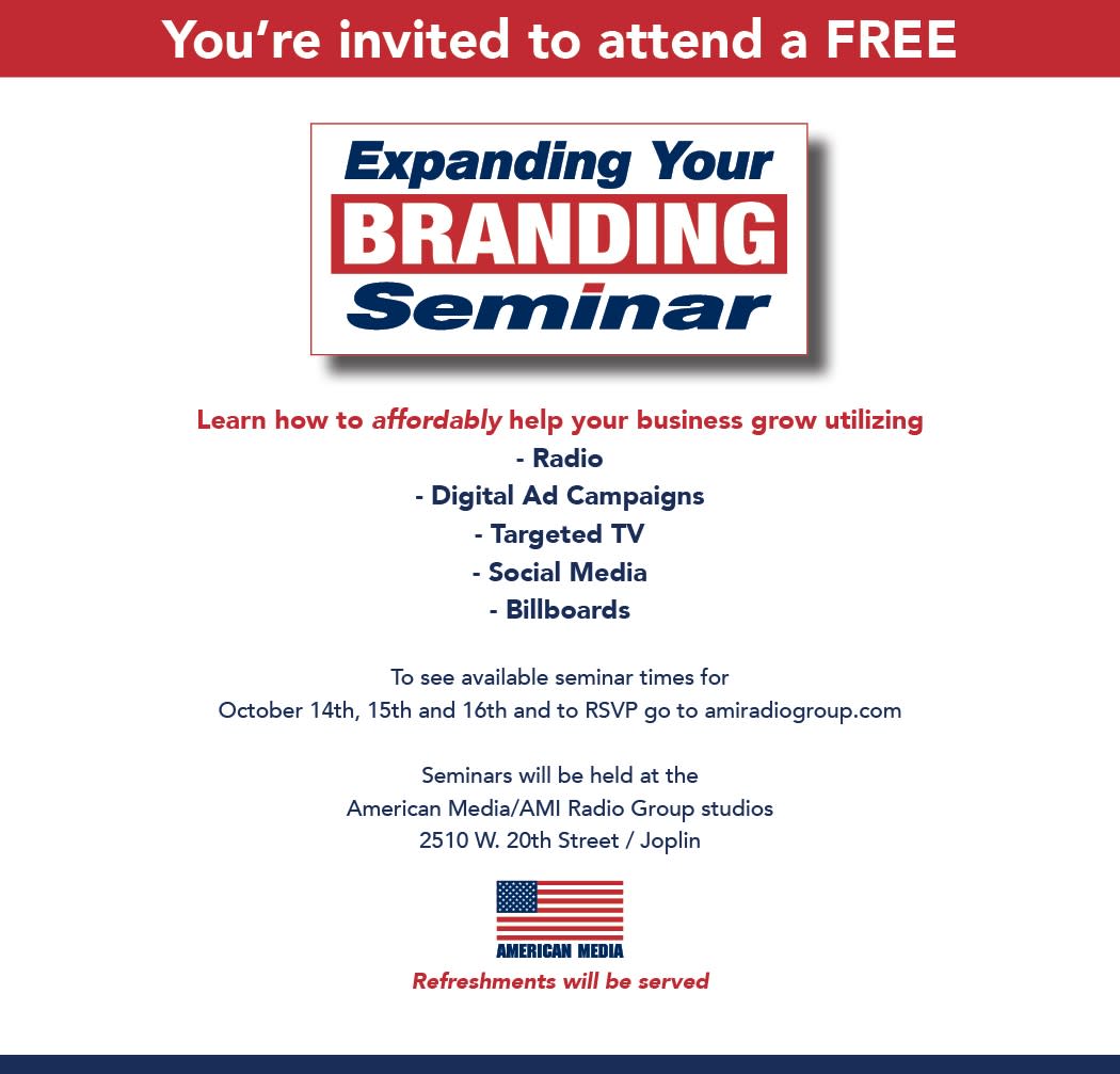 American Media/AMI Radio & Marketing Group invites you to attend a FREE "Expanding Your Branding" seminar October 14th-16th. Learn how to affordably promote your business and job openings utilizing radio, digital ad campaigns, targeted TV, social media and more! To RSVP go to amiradiogroup.com.