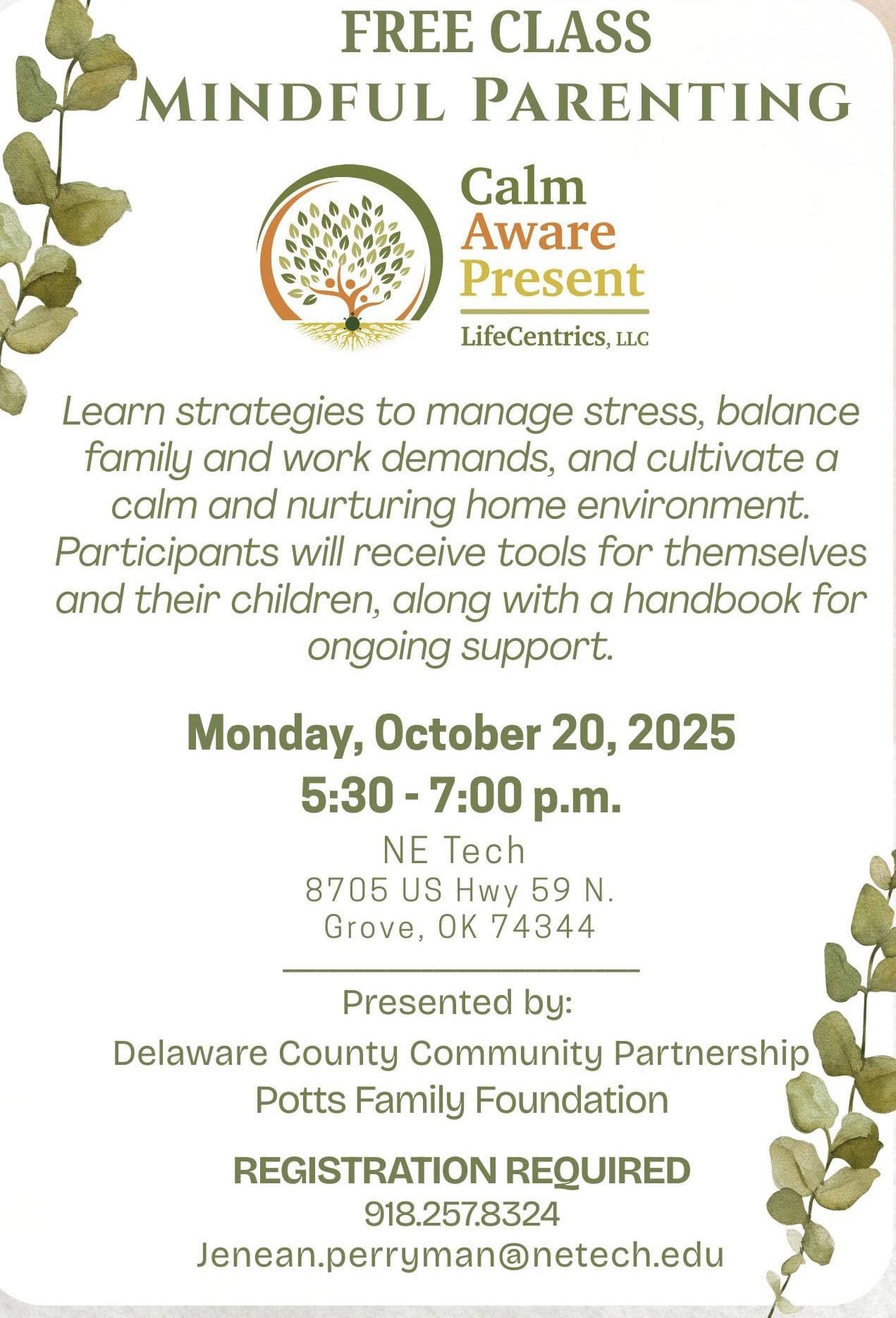 Learn strategies to manage stress, balance family and work demands, and cultavate a calm and nurturing home environment. Participants will receive toos for themselves and their children, along with a handbook for ongoing support. Event hosted at NE Tech BIS. Registration required: 918-257-8324 or jenean.perryman@netech.eduImages