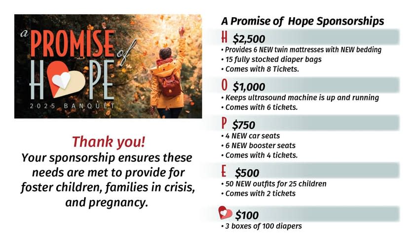 Each sponsorship helps us provide different items within Abundant Hope to help support Families in need, Foster care, and Pregnancy! Be sure to purchase your ticket OR sponsorship level below!! š