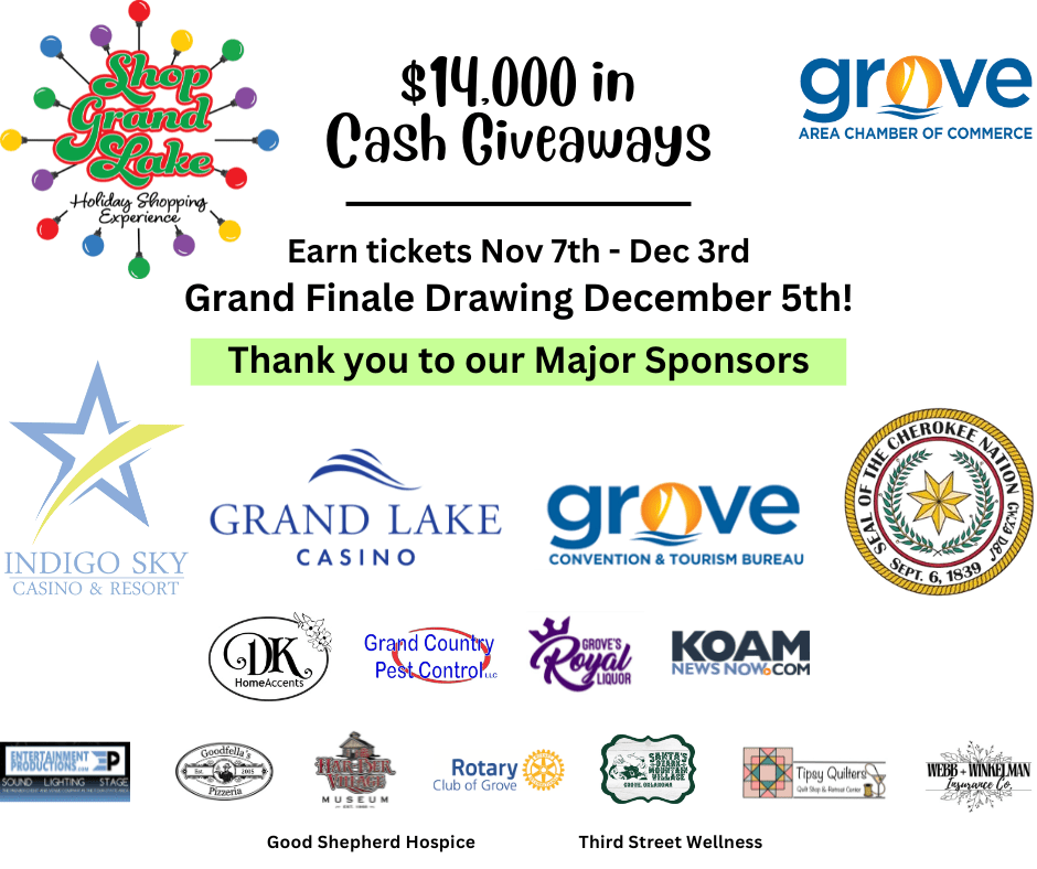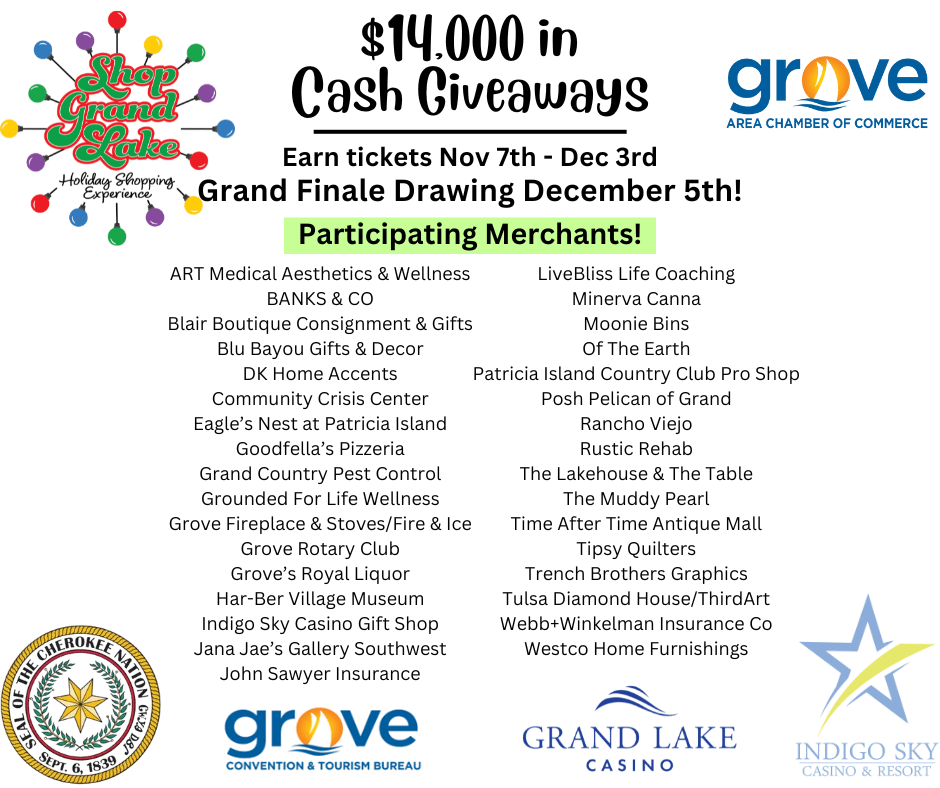 The drawing for $10,000 cash will be held on Friday, December 5th at the Grand Finale Celebration at Lights on Grove in conjunction with the Ron Lay Light up Downtown Event. Weekly cash drawings will start on Wednesday, November 13th and run for 4 weeks. Follow the Grove Area Chamber Facebook page for more detailed information.