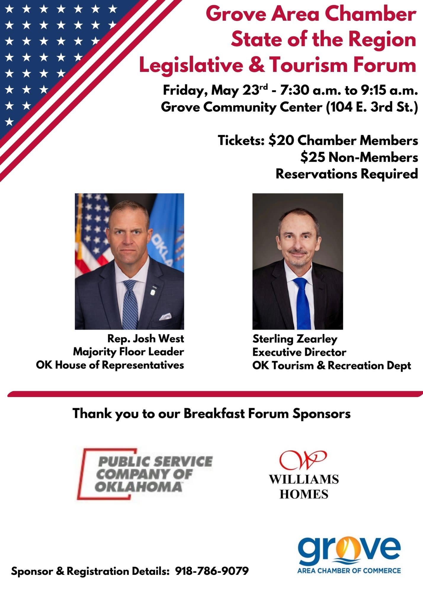 State of the Region Breakfast Forum featuring officials from the state and region to provide an update on legislative and tourism initiatives in and around the Grand Lake region. Tickets are $20 per person for members and $25 per person for non-members. The Gold Sponsorship level is $500 and includes tickets for a table of 8 and your business or organizations logo included in the event program and promotions. The Silver Sponsorship level is $250 and includes tickets for a table of 4 and your business or organization listed in the event program and promotions.