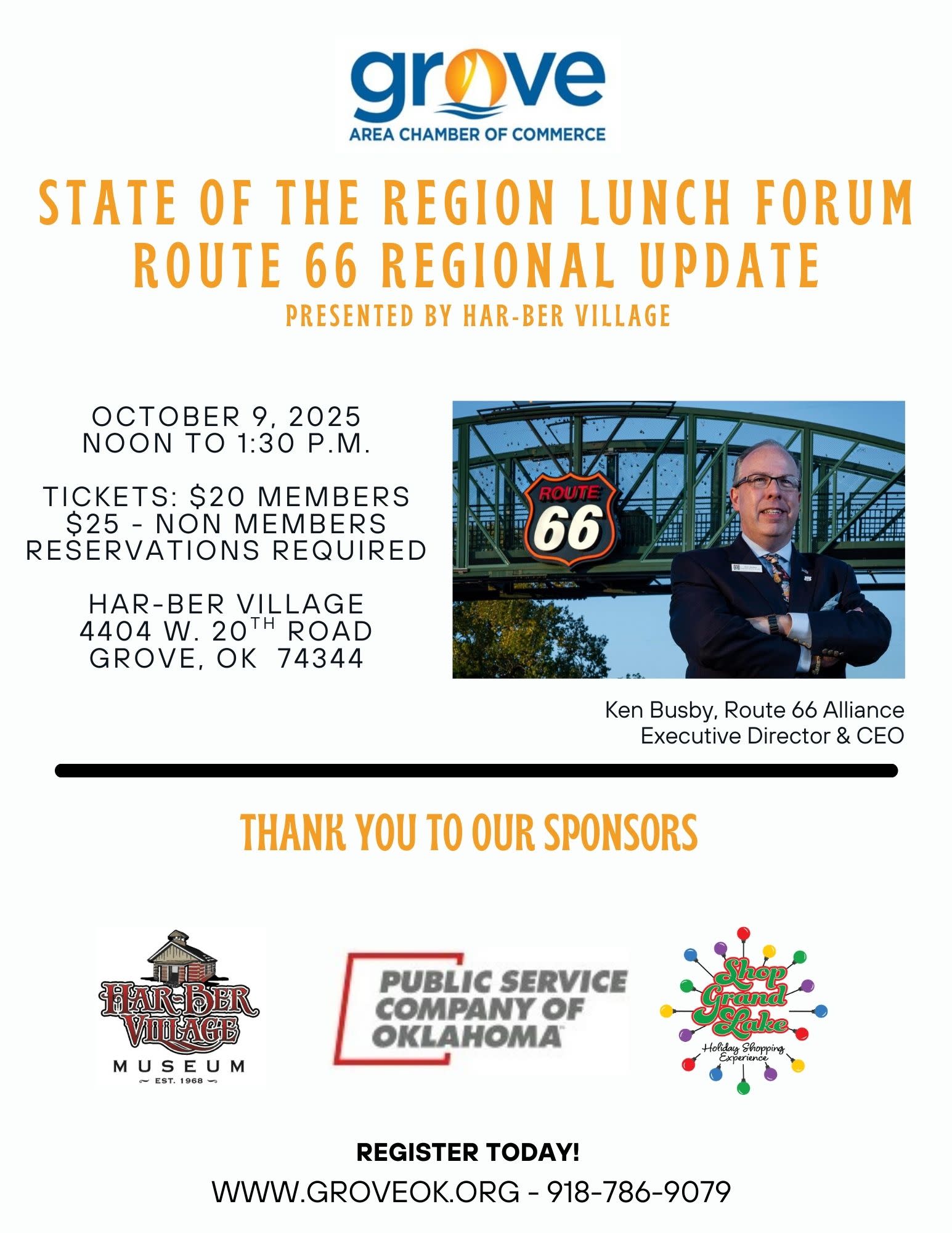 Join at at Har-Ber Village in the outdoor pavilion for our next series in the State of the Region Lunch Forums. Our special guest will be Ken Busby with the Route 66 Alliance. Ken is helping lead the way for the upcoming Route 66 Centennial Celebration that will take place in 2026. Come learn about all the special events happening to recruit non-locals into Delaware County and Northeast Oklahoma as they journey across the United States on the historic mother road.Images