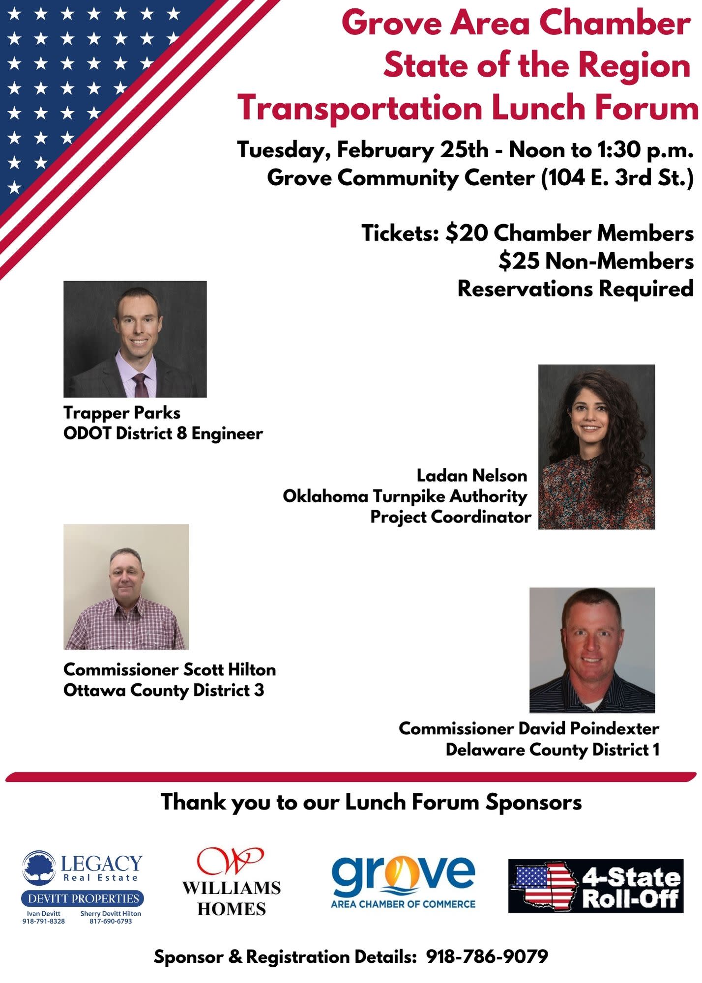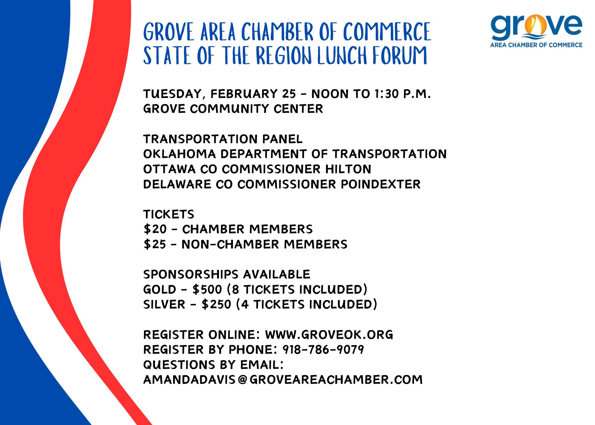 State of the Region Lunch Forum featuring officials from the state and region to provide an update on transportation projects in and around the Grand Lake region. Tickets are $20 per person for members and $25 per person for non-members. The Gold Sponsorship level is $500 and includes tickets for a table of 8 and your business or organizations logo included in the event program and promotions. The Silver Sponsorship level is $250 and includes tickets for a table of 4 and your business or organization listed in the event program and promotions.